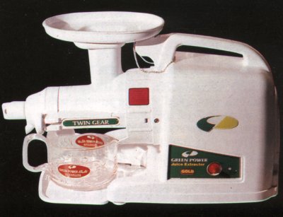 Green Power Gold Juice ExtractorYou are not What You Eat, But What you Absorb. The rate of absorption of juice has never been considered a factor in comparing juicers. With the introduction of Green Power's magnetic Twin Gear press, this has now changed. Experiments conducted by the Green Power Co. Research and Development Dept. show the rate of absorption of green juice using dual gear extraction is up to five times greater than using centrifugal extraction.